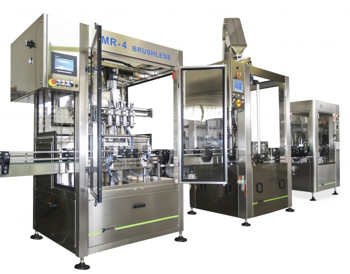 Linea di produzione per creme, shampoo, tonici, gel, ecc. Adatta per prodotti cosmetici in Flaconi o vasetti in PE con tappo a vite filettato. La linea è composta da un tavolo di carico motorizzato Ø 800 mm,  monoblocco di riempimento modello MR-4 brushless con 4 cilindri volumetrici azionati da motori brushless oppure da sistemi massici con ugelli otturatori antigoccia, ugelli ad immersione con chiusura contraria per prodotti schiumosi, tramoggia in acciaio inox AISI 316 con coperchio e sonde di livello, tutti i sistemi sono controllati da PLC con pannello operatore touch-screen, monoblocco di tappatura modello MTS-1  adatto a tappi a vite, a pressione, flip-top con carico automatico dei tappi tramite elevatore meccanico, Etichettatrice per tondi, rettangolari e ovali, tavolo di accumulo motorizzato Ø 1000 mm.